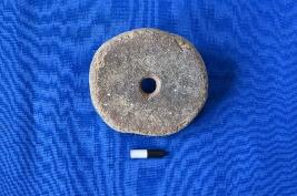 | Description / विवरण | A wheel of terracotta in micaceous red ware with one side in red and the other side is greyish, has a smooth surface and a hole in the center. |