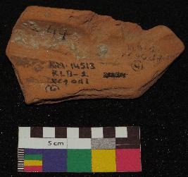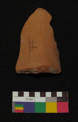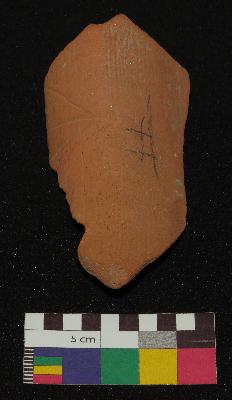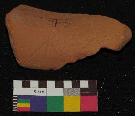 | Description / विवरण | Well fired, fragment of red ware pot is red in color, made of well levigated clay, having medium out-turned rim, curved neck, smooth surface and medium section. The graffiti is inscribed on the inner part of the potsherd, it has an incised vertical line and two oblique lines, which intersect with each other and forms a trident symbol. It also have traces of painting in black color. |