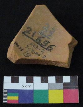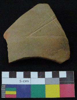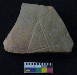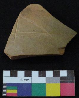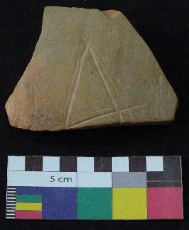 | Description / विवरण | Well fired, fragment of red ware pot is dull red in color, made of well levigated clay, have smooth surface and thin section. The graffiti is inscribed on the exterior part of the potsherd. It has three oblique lines formed a triangle and many faded strokes. |