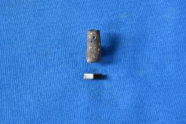 | Description / विवरण | A cylindrical shaped pendant of terracotta in black colour with tapering sides, flat circular base and transverse perforation near the top. |