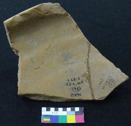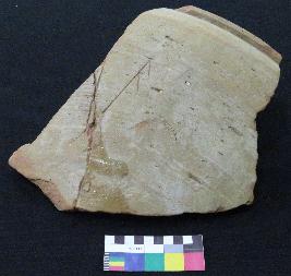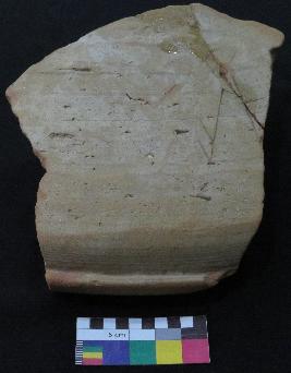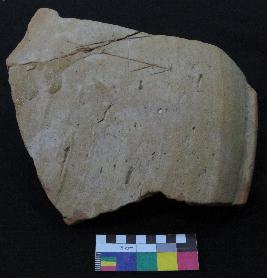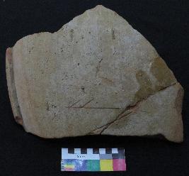 | Description / विवरण | Well fired, fragment of red ware pot is red in color, made of well levigated clay, have out-turned rim, buff slip, smooth surface and medium section. The graffiti is inscribed on the exterior part of the potsherd. It has incised V sign and two oblique lines. |