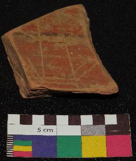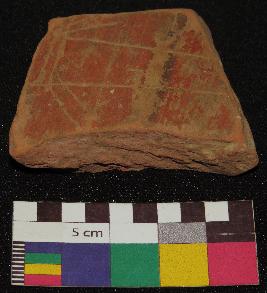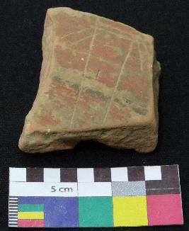 | Description / विवरण | Well fired, fragment of red ware pot is red in color, made of well levigated clay, have slip on outer surface, smooth surface and medium section. The graffiti is inscribed on the exterior part of the potsherd. It has two incised vertical parallel lines, two horizontal lines above it and two pair of oblique strokes on top. |