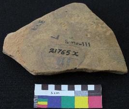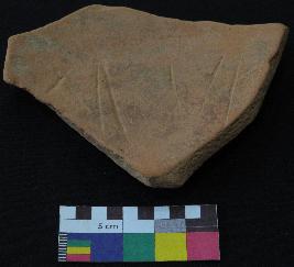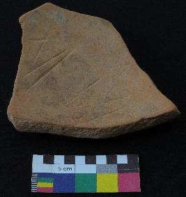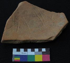 | Description / विवरण | Well fired, fragment of red ware pot is red in color, made of well levigated clay, have smooth surface and thin section. The graffiti is inscribed on the inner part of the potsherd, it has cross mark on left side and five oblique line. |