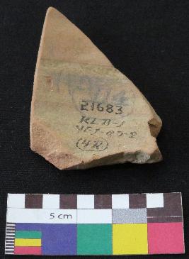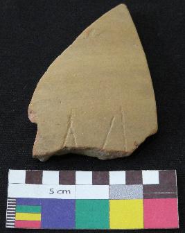 | Description / विवरण | Medium fired, fragment of red ware pot is red in color, made of well levigated clay, have smooth surface and thin section. The graffiti is inscribed on the inner part of the potsherd, it has two V signs on it. |