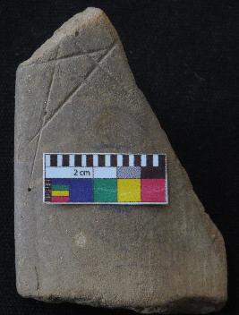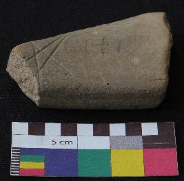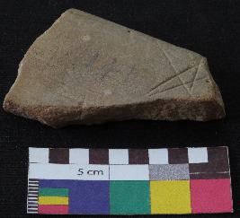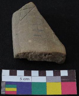| Description / विवरण | Medium fired, fragment of red ware pot is dull red in color, made of well levigated clay, have out-turned rim and medium section. The graffiti is inscribed on the inner part of the potsherd. It has a star shaped design inscribed on it. |