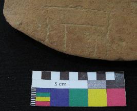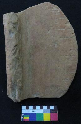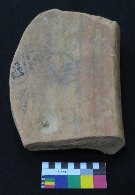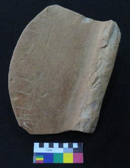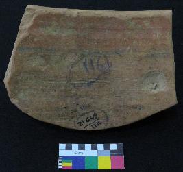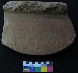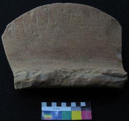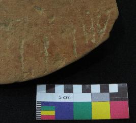 | Description / विवरण | Well fired, fragment of red ware pot is red in color, made of well levigated clay and have thick in-turned rim, smooth surface and thick section. The graffiti is inscribed on the exterior part of the potsherd. On the right it consist set of vertical line, but their shape cannot be made out, in middle two vertical strokes are inscribed and on left the sign consist four vertical line with two horizontal lines above it. |