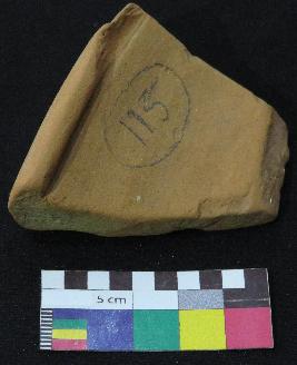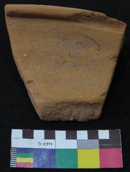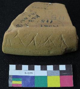 | Description / विवरण | Well fired, fragment of red ware pot is red in color, made of well levigated clay and have thick in-turned rim, smooth surface and thick section. The graffiti is inscribed on the rim of pot, it has total five signs. |