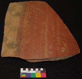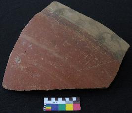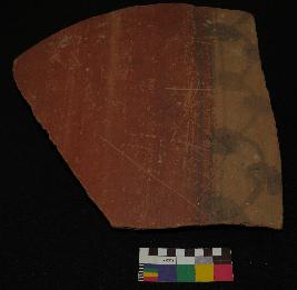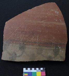 | Description / विवरण | Well fired, fragment of red ware pot is red in color, made of well levigated clay and have smooth surface and thick section. The graffiti is inscribed on the exterior part of the potsherd, it has many horizontal and vertical lines and painting in black color on buff surface. |