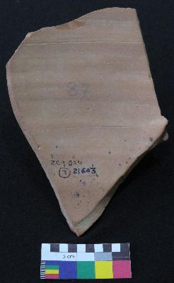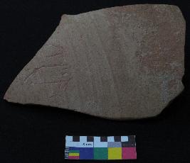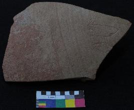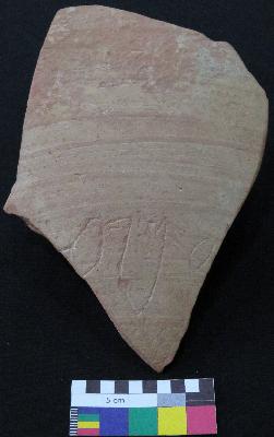 | Description / विवरण | Well fired, fragment of red ware pot is red in color, made of well levigated clay and have smooth surface and thick section. The graffiti is inscribed on the exterior part of the potsherd, it has total three signs. On left side it has an incised oval shaped sign with an oblique stroke, followed by a V shaped sign with a pair of two oblique stroke on top, inner side of V sign there are three vertical lines and on right side a small oval shaped sign. |