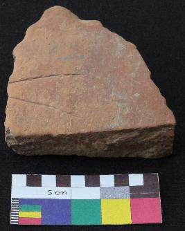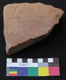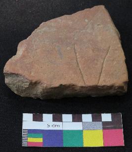 | Description / विवरण | Well fired, fragment of red ware pot is red in color, made of well levigated clay and have slip on outer surface, smooth surface and thick section. The graffiti is inscribed on the exterior part of the potsherd, it has two incised oblique lines. |