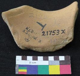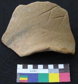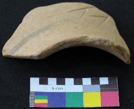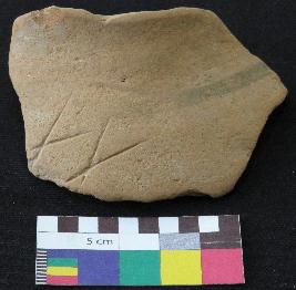 | Description / विवरण | Well fired, fragment of rimless red ware pot is red in color, made of well levigated clay and have smooth surface and thin section. The graffiti is inscribed on the exterior part of the potsherd, it has two incised cross mark and traces of black band painted at shoulder. |