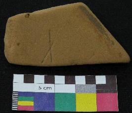 | Description / विवरण | Medium fired, fragment of rime portion of red ware pot is red in color, made of well levigated clay, have thin rim, smooth surface and medium section. The graffiti is inscribed on the exterior part of the potsherd, it has a two incised cross mark, one is not clearly visible. Trace of black band painted around the rim. |