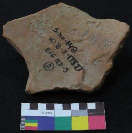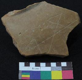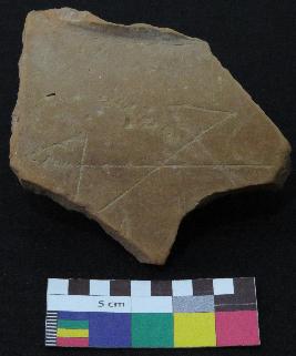 | Description / विवरण | Well fired, fragment of red ware pot is red in color, made of well levigated clay and have out smooth surface and medium section. The graffiti is inscribed on the exterior of shoulder part of the potsherd, it has four triangles joins each other. |
