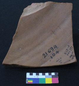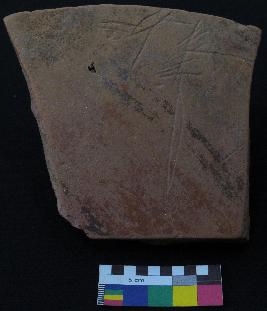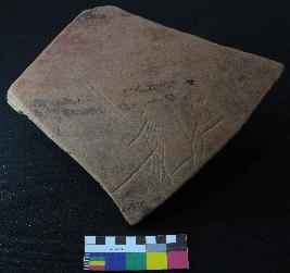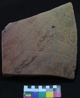 | Description / विवरण | Well fired, fragment of red ware pot is red in color, made of well levigated clay and have smooth surface and thin section. The graffiti is inscribed on the exterior of shoulder part of the potsherd. On the right a fish like design is inscribed with five oblique strokes, two at the lower part, one is at the left side of upper part and two strokes on the right side of upper part. The design inscribed in the middle is complicated, it has seven oblique strokes cut by an oblique line and the line intersect by horizontal line going leftwards and a fish like design on the above of it. On the left-hand side shows a vertical line with two oblique strokes. |