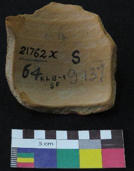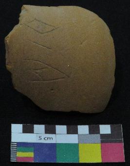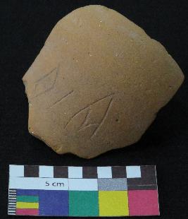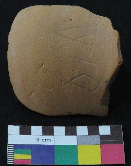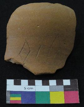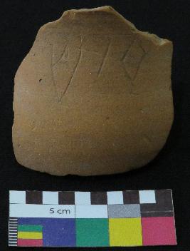 | Description / विवरण | Well fired, fragment of rimless red ware pot is red in color, made of well levigated clay and have curved neck, shoulder, smooth surface and thin section. The graffiti is inscribed on the exterior of shoulder part of the potsherd. On the left side it has incised V sign with up-turned oblique curved strokes which join each other and a horizontal small line which intersect on the right side of it. In the middle it has an oblique stroke and, on the right sided it has incised four line which joins each and forms a rhombus shape. |