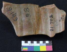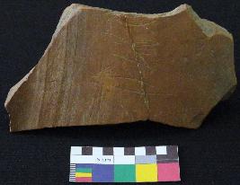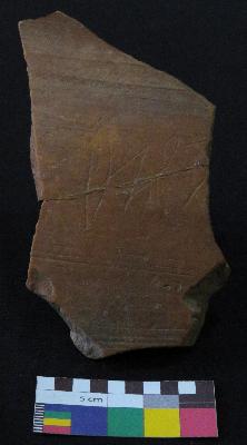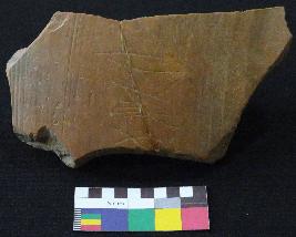 | Description / विवरण | Well fired, fragment of red pot is dull red in color, made of well levigated clay and have smooth surface and medium section. The graffiti is inscribed on the exterior part of the potsherd, total four signs are inscribed. On the left side it has a incised V sign with a pair of two inverted oblique strokes, followed by a Z shaped sign, which also followed by a fish design which has four parallel vertical lines at tail of it and on extreme right probably a fish design is inscribed, which is damaged and not clearly visible. |