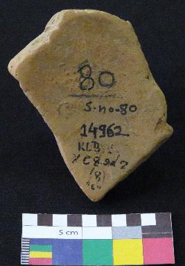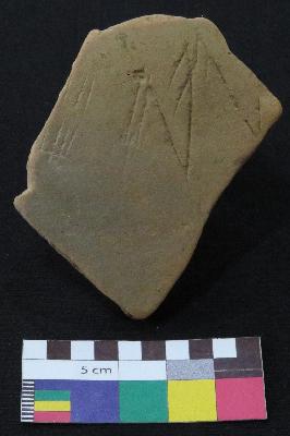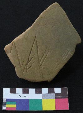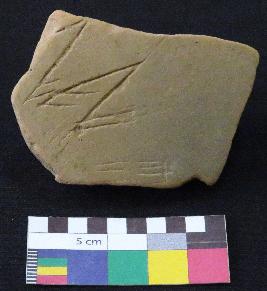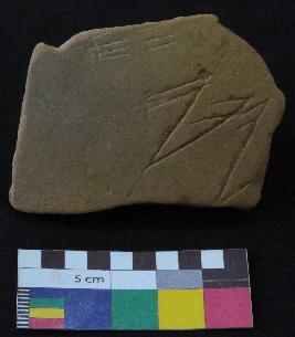 | Description / विवरण | Well fired, fragment of red ware pot is red in color, made of well levigated clay and have smooth surface. The graffiti is inscribed on the exterior part of the potsherd, on the right side it has incised two V shaped design with pair of two oblique on each branch, on the extreme life side pair on three vertical line and a pair of four vertical lines with a horizontal line below it, which intersects all the four lines. |