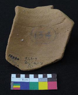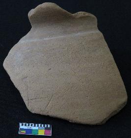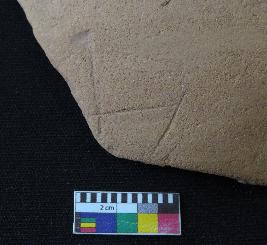 | Description / विवरण | Well fired, fragment of red ware pot is red in color, made of well levigated clay, having thin outturned rim, neck, globular body, thin section and smooth surface. The graffiti is inscribed on the exterior part of the potsherd, it has incised two lines which are intersecting with each other and two oblique stokes at the end of the lines. |