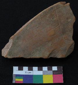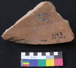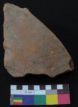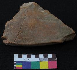 | Description / विवरण | Well fired, fragment of red ware pot is red in color, made of well levigated clay and have smooth surface. The graffiti is inscribed on the exterior part of the potsherd, it has incised line design, the shape is not clear. |