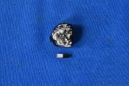 | Description / विवरण | A roughly square shaped moulded amulet of black glass with an elephant to the right with a raised trunk in front of a railing. The flan has traces of grooves all around for attaching to some metal frame with a hook or ring for suspension. |