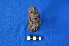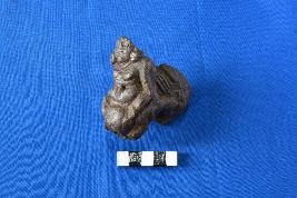 | Description / विवरण | A unique object depicting a corpulent Yaksha seated on a garuda-like bird with a couple of perforation intersecting on either ends and converging into one which ultimately runs across the body. A portion of a side is chipped off. It might have been used as a handle for some mechanical device. |