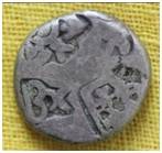 | Description / विवरण | The shape of the coin is circular. This is an imperial type of punch marked coin. Obverse Crescent top three arched hill, six armed symbols. Four fish within a tank. Reverse Blank. |