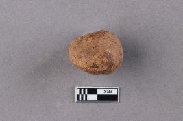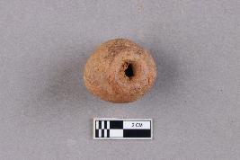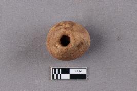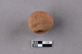 | Description / विवरण | An irregularly shaped, slightly rounded bead of terracotta. The perforations are visible on each side. |