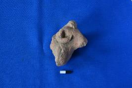 | Description / विवरण | A fragment of a handmade ram head in red colour with pinched eyes, drooping horns bear a series of notches and having a smooth surface. |