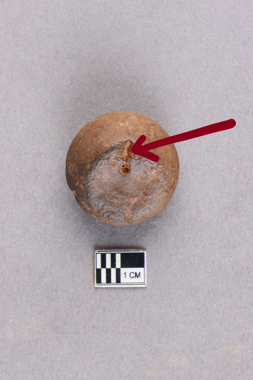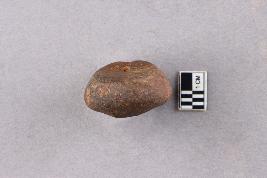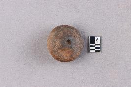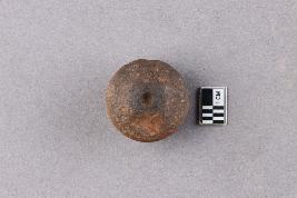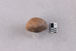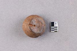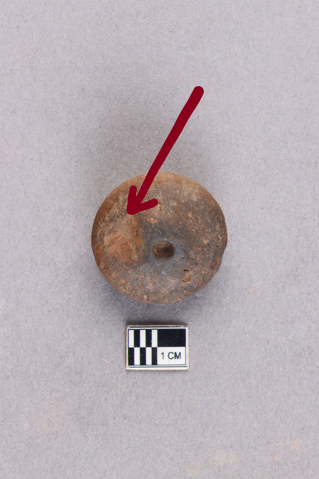 An areca nut-shaped terracotta bead blank. The perforation marks on either side are visible but they do not go through and are false.