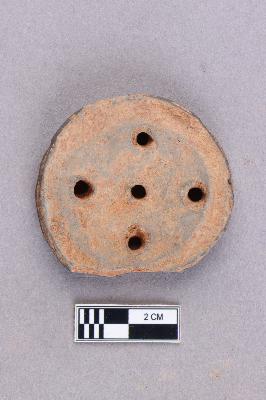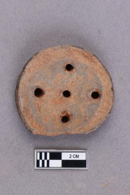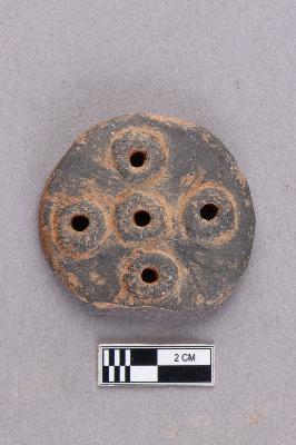 | Description / विवरण | A flat, circular terracotta disc with five perforations on it. It is grey in colour. The central perforation is surrounded by four other perforations arranged in different directions, each on a slightly raised circle. The obverse is absolutely unpolished with a shallow groove near the periphery and there is a chip on one side at the periphery. |