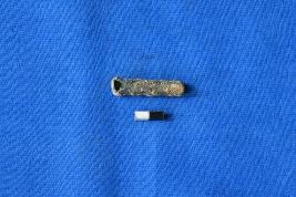 | Description / विवरण | A tubular shaped bead of copper with a corroded surface and perforation at the center. |