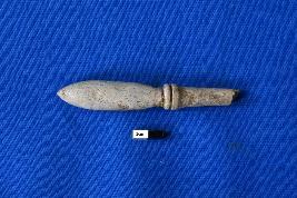 | Description / विवरण | A fragment of an ivory hair pin in white colour with a flower bud shaped end and two bands at one end, while the other end is broken. |