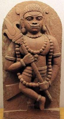 | Description / विवरण | The sculpture is the Gate keeper of Shiva erects his left leg acrossing with right leg. Two hands of this image holds Trisula. He adorned with a three rudramala. His facial expression shows as terrific position. He has rounded moustache. |