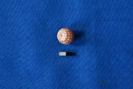 | Description / विवरण | A spherical shaped bead of carnelian with white dots etched in parallel rows all over the surface and perforation at the center. |