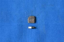 | Description / विवरण | A square shaped punch marked copper coin of non-provincial type with a six armed symbol, three arched hill with crescent top, elephant and bull on the obverse and sign within the circular incuse showing an animal to left, possibly standing in front of a tree on the reverse. |