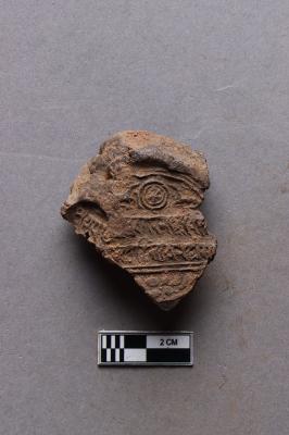 | Description / विवरण | A partly broken clay lump bearing the impression of a partially available Mahavihara legend in two lines within a circular incuse, with the Chakra flanked by deer motif above and the lotus motif below. Part of the sealing is broken and missing. This incuse was further counter-struck by another one bearing a single legend on the periphery of the larger incuse. The back has a knob. The script is Siddhamatrika. |