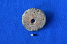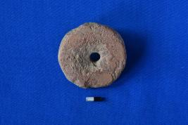 | Description / विवरण | A circular shaped wheel of terracotta with a hole in the centre roughly, with tempering material in the fabric and a red slip which has been worned off. |