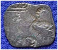 | Description / विवरण | The coin is an imperial type of Punch- marked coin. The shape of the coin is irregular. Obverse Sun, tree, a taurine, three mountain, six armed wheel mountain, animal, dot within a circle next to it also found same within a box. Reverse Crescent topped three arched hill, six armed wheel. |