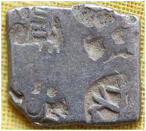 | Description / विवरण | The coin is an imperial type of Punch-marked coin. The coin is irregular in shape. Obverse Branches of tree, six armed wheel, Sun, three arched hill with crescent at the top and other symbols are indistinct. Reverse Four crescents placed around a dot. |