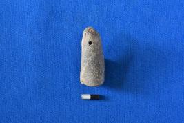 | Description / विवरण | A cylindrical shaped pendant of terracotta in red ware with tapering sides, flat circular base, transverse perforation near the top and a smooth surface. |