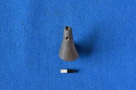 | Description / विवरण | A conical shaped pendant of terracotta in black colour with a smooth surface and a transverse perforation near the top. |