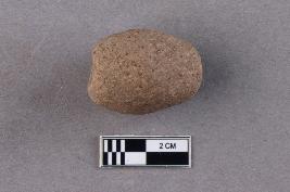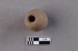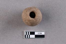 | Description / विवरण | A rounded bicone bead of terracotta with a central perforation. |