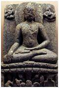 | Description / विवरण | Two armed Buddha in Bhumisparsa Mudra seating on a two petalled lotus pedestal. His right hand touches the earth while his left hand rests on the palm of the foot. Prabhamandala is seen in his back side of the head. One flying Gandharva is shown on each side at the top of the figure. The lotus pedestal having a lady figure in namaskara mudra and a conch is kept on a small stand. |