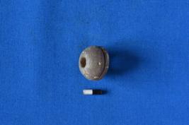 | Description / विवरण | A ghata shaped bead of terracotta in grey colour with smooth surface and a perforation at the center. |