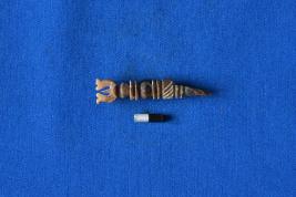 | Description / विवरण | A fragment of a kohl stick or hair pin of ivory with lower portion broken and upper portion bears Triratna sign followed by a decorative segments. |