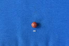 | Description / विवरण | A spherical shaped bead of carnelian in red colour with a smooth surface and perforation at the center. |