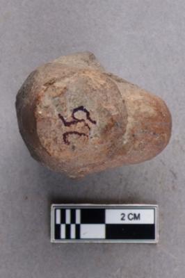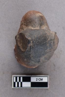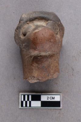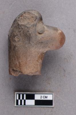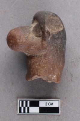 | Description / विवरण | The head portion of an animal figurine with beaded eyes, broken ears, and a rounded protrusion, which may represent a snout. It is reddish and grey in colour. |