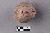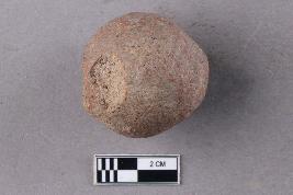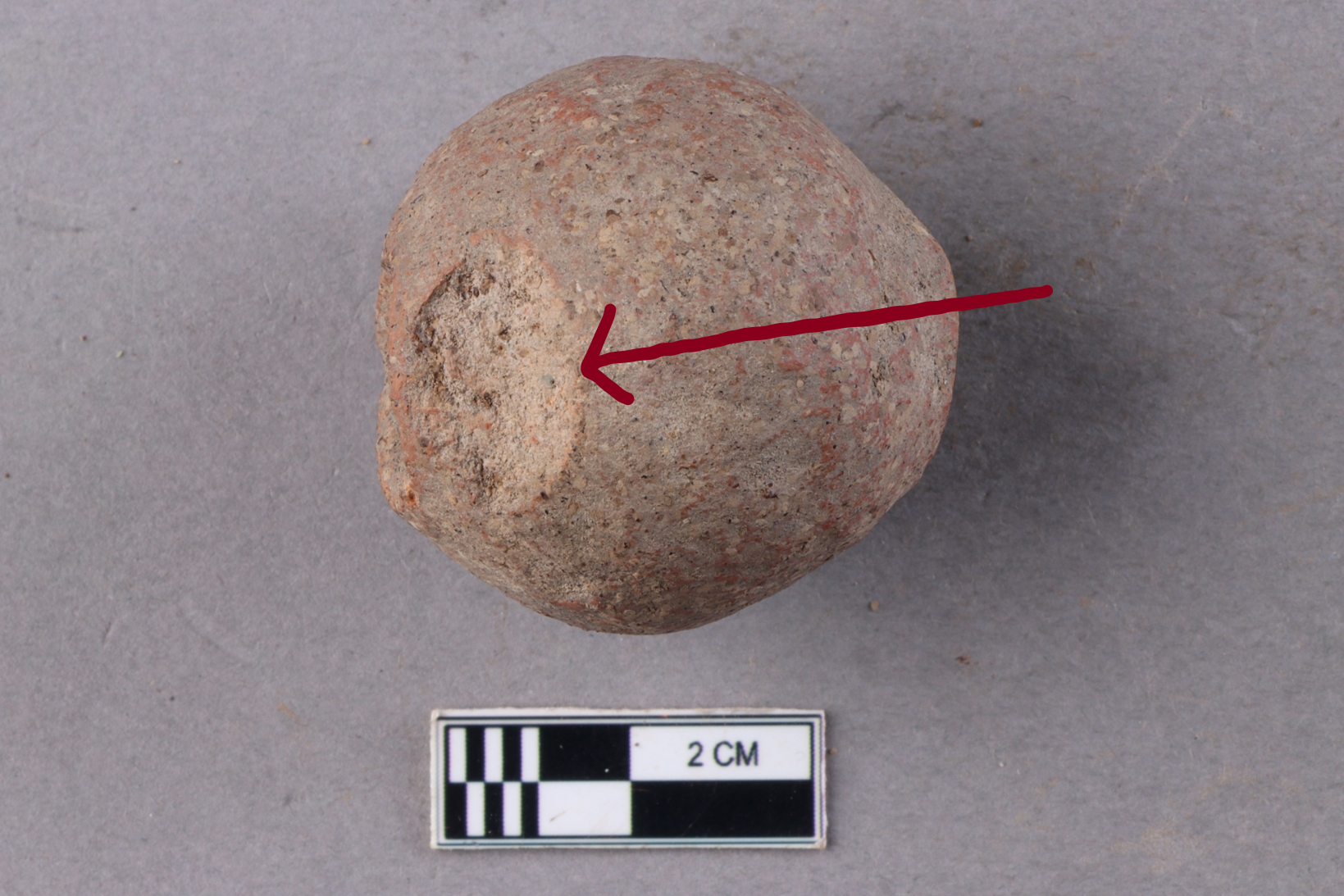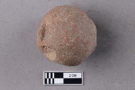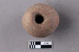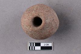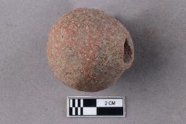 A spherical terracotta bead with central drilling pattern. It is red in colour.