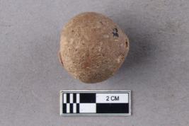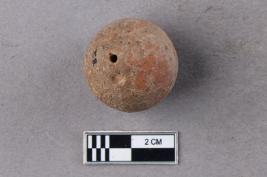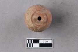 | Description / विवरण | An areca nut-shaped bead with top drilled perforation which probably has a conical drill pattern. There is a groove around one perforation. The bead is red in colour. |