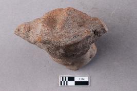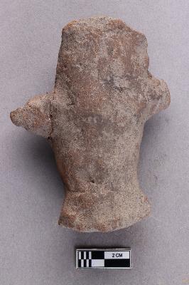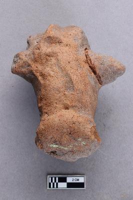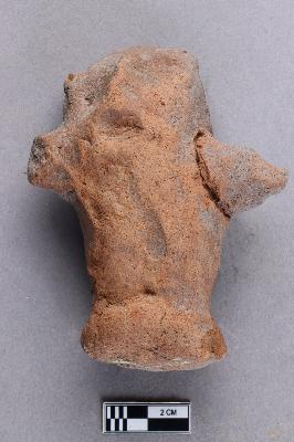 | Description / विवरण | A terracotta figurine that is irregularly cylindrical and solid. Two tapering conical appendages are seen protruding from both sides close to one end. It is red in colour. |